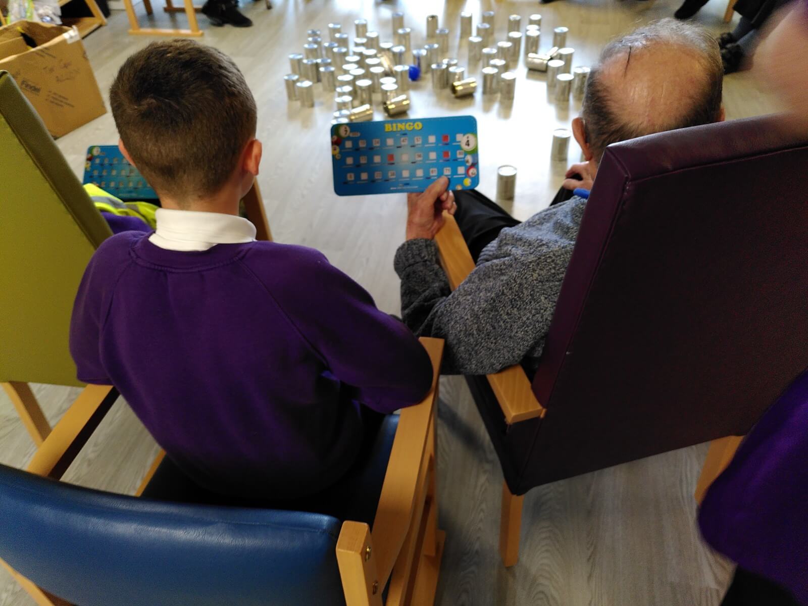 The more we can fill ourselves up with love for the people in front of us in the here and now and on a regular basis, the deeper our empowering impacts can become. This photo is such an important symbol of this project. The two people in the picture are amongst the quietest in the group; the child started the project incredibly shy, and spoke very quietly, while the adult struggled to interact with others due to being deaf in one ear, difficulty with his vision, and living with dementia. While playing a game of tin bingo, they began to speak quietly to each other during the game, and the adult commented at the end that the child ‘is a fine chap.’ For the child, this experience was a step towards increasing self-confidence, leading to him having the courage to team up with another Kingswood friend the following week. On the walks to and from Kingswood he is now beginning to initiate conversations with me instead of me always taking the lead, and his voice is now a bit louder and stronger in presence. For the adult in the picture, he is starting to connect more regularly with the children in the group, smiling and laughing more, and helping to sustain conversations over a longer period.