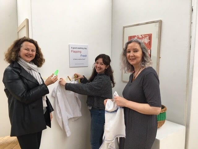 Many of the images that feature in Encounters were on display at the launch, together with accompanying exhibits. The above photograph was taken in front of one exhibit – an image called ‘Neighbourhood Watch’ by Edwina Jill Wilkie, together with a washing basket, clothes peg and line, the caption ‘A good washing day’. Pictured in the photograph from right to left are Anne O’Connor, Chief Executive of Art in Healthcare, Rebecca Leary, Festival Marketing and Programme Officer at Luminate, Scotland’s Creative Ageing Organisation and independent creative collaborator, Madgalena Schamberger, who was taking a short break from the tour of her latest theatre production, Curious Shoes – a joyful performance that provides an opportunity for persons living with dementia to see a high quality piece of theatre without it being a worrying or stressful experience for them.